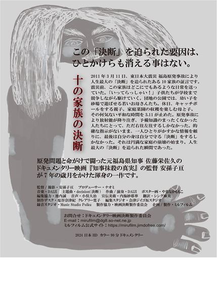 『霧幻鉄道』を手がけた安孫子亘監督が、東日本大震災で起きた福島第一原発事故で決断を迫られた人々を追ったドキュメンタリー。2011年3月11日を境いに一変した生活と、13年が経過した現在も3万人が避難生活を余儀なくされる原発問題について、10の家族の証言を通して、彼らが迫られた決断を描く。主題歌はDAIJIによる“決断”。