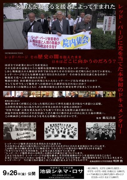 第2次世界大戦後の1949~51年、GHQ占領下の日本で、日本共産党員とその支持者たちを対象とした、思想弾圧事件を追ったドキュメンタリー。公務や民間企業の職場から不当な理由で職を奪われ、歴史の片隅で名誉回復と賠償を求めた運動を、当事者の証言を基に明らかにしていく。監督は鶴見昌彦。出演は大橋豊、権田圭助、秋山富美子ら。