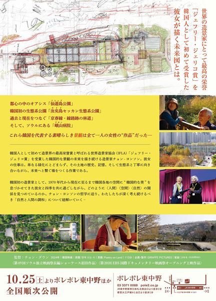 2023年に造景界最高の栄誉、国際造園家協会ジェフリー・ジェリコ賞に輝いた、初の韓国人造景家チョン・ヨンソンを追ったドキュメンタリー。単なる緑化ではなく、土地の歴史や生態系と向き合いながら、各地に韓国の美を息づかせてきた彼女が、どのように人間・空間・自然を繋げていったのかを四季の移ろいと共に紐解く。監督はチョン・ダウン。