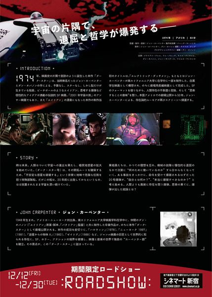 『遊星からの物体X』などを手がけたジョン・カーペンター監督の長編デビュー作『ダーク・スター』をデジタルリマスター版で上映。人類が宇宙へ進出し、植民地惑星を拡大していく未来を舞台に、開拓ルートを確保する特殊な任務を負った宇宙船の乗組員を描く。出演はブライアン・ナレル、ドレ・パヒッチ、キャル・クニホルム、ダン・オバノンほか。