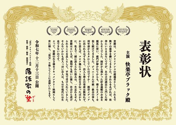 立川談志の弟子であり、過激な芸風で根強い人気を誇る落語家・快楽亭ブラックを追ったドキュメンタリー。コンプライアンス遵守が叫ばれる現代、その芸風から"生ける伝説"と称される彼の、破滅的な生き様を映し出す。監督は榎園喬介。主演は快楽亭ブラック。共演は立川談之助、鈴々舎馬るこ、げんきいいぞう、大本営八俵ら。語りは坂本頼光。
