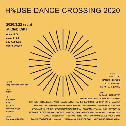 【SHOW】 Be drunk / BOUNSTEP / CHINA HOUSE UNIT1 / CHINA HOUSE UNIT2 / KAH(Aiko+MIKIPAN+shiho+AKINO+mayuko+ARISA) / KANSAI BAKUDAN / LUCIFER+Miyu / Lunatik / NEW YELLOW / NUMBER NINE (SU→,MOTOKI,MOTSU,shota,caolii,akiho) / OKINAWA HOUSE UNIT / OVERAIZ from KOREA / OVERSTEP CREW + RIPUKA / Padre+Minori+Jungle Kick / PINOCCHIO / RICEBALL CREW & Jasmine / SODEEP / studio egg crew / SYMBOL-ISM (TAKUYA,Suthoom,RYOakaDJ226) / TAIWAN HOUSE UNIT / TERM-INAL / The 1996 / TOHOKU FEMALE HOUSE UNIT / TOKYO FOOTWORKZ / Toremolo / YANMA+KOUSUKE+BROWN / YU-YA+NUE+NAOKI+MUKAI