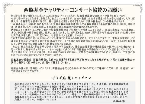 ※ご購入時の手数料に関しまして:ご購入方法にかかわらず、システム利用料は発生いたしません。ご案内画像に掲載されておりますチラシ表面の■チケットぴあ■購入方法の中、お電話で予約の方のご購入の場合もシステム利用料は、発生いたしません。新型コロナウイルス感染症災禍による公演中止の折は、期間内に発券店舗での返金手続きをお願い致します。払い戻し対象:チケット代金/発券手数料(決済手数料は払い戻し対象外です)※問い合わせ:080-3368-8772(畠山)迄。また、払い戻しをご希望なさらず、チケット代のご寄附をご希望される場合は、西脇基金を支える会 03-3256-3674迄お問い合わせください。