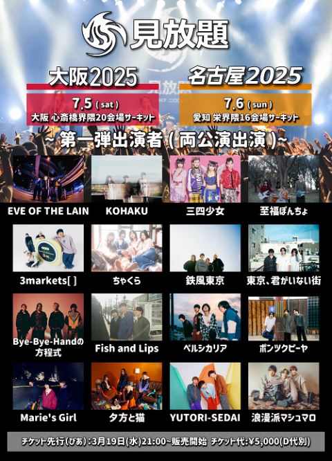3歳以上チケット必要。再入場可。チケットはチケット交換所(SUNHALL B1F)にて全会場周遊可能リストバンドに交換してください。各会場満員の際は、入場制限をかける可能性があります。出演者は変更の可能性もあります。出演者変更に伴う払戻しは致しません。ご了承下さい。