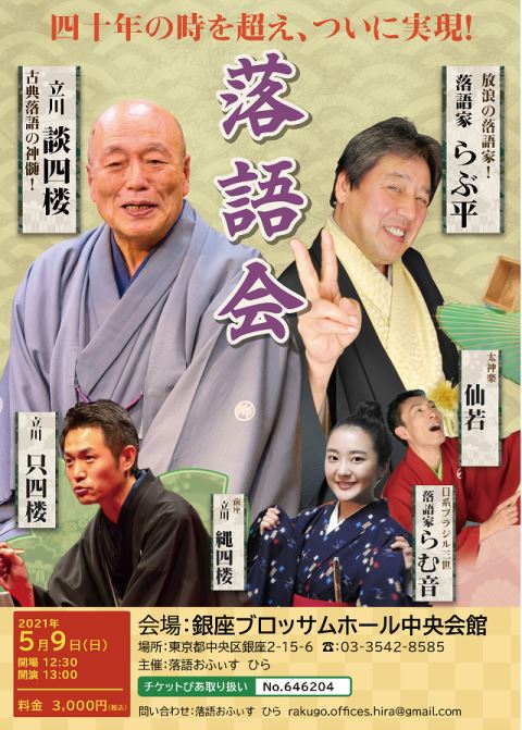 落語家らぶ平 立川談四楼 遂に実現!40年目の落語会 21/5/9(日) 銀座ブロッサム(中央会館) シェア ツイート 2021年 40年の時を越え!ついに実現!落語家らぶ平 立川談四楼 落語会 開催情報 問合せrakugo.offices.hira@gmail.com 料金 全席自由-3,000円 表示できるチケット情報はありません詳しくはこちら キャスト&スタッフ 出演 立川談四楼 らぶ平 立川只四楼 仙若 らむ音 立川琉四楼 [出演]立川談四楼 / らぶ平(落語家) / 立川只四楼 / 仙若(太神楽) / らむ音(落語家) / 立川縄四楼 お問い合わせ 落語おふぃす ひら シェア ツイート