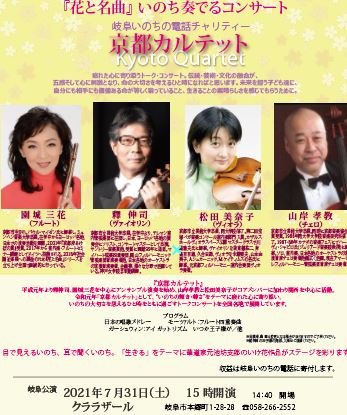 花と名曲いのち奏でるコンサート岐阜 21/7/31(土) 真鍋記念館クララザール シェア ツイート 疲れた心に寄り添うトークコンサート。ステージを彩る華道家元池坊支部のいけ花~目と耳で感じるいのち~ 開催情報 ご入場時にチケット半券へご連絡先記入をお願いします。出演者、曲目は変更となる場合がございますがご了承ください。マスク着用をお願いします。不可抗力により中止する場合以外は料金の払い戻しはいたしません。未就学児童のご入場はお控えくださいませ。 料金 自由席-2,000円 表示できるチケット情報はありません詳しくはこちら キャスト&スタッフ [出演]園城三花 / 釋伸司 / 松田美奈子 / 山岸孝教 お問い合わせ 岐阜いのちの電話(平日・午前中) シェア ツイート