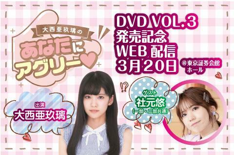【動画配信】大西亜玖璃の「あなたにアグリー」DVD VOL.3発売記念イベント 22/3/20(日)~22/3/27(日) PIA LIVE STREAM シェア ツイート 開催情報 この公演はオンライン動画配信でのみご覧いただけます。配信時間・出演者は予定のため変更の可能性あり。イベント内容に関する詳細はinfo-phonon@tenfeet.co.jpまで。【視聴についての問合せ】event@linkst.jp(平日10:00-18:00)。公演日は配信終了1時間後まで土日祝も対応可能。 料金 オンライン視聴券-6,930円 オンライン視聴券-DVDの送料込み 表示できるチケット情報はありません詳しくはこちら キャスト&スタッフ 出演 大西亜玖璃 ゲスト 社本悠 [出演]大西亜玖璃 [ゲスト]社本悠 シェア ツイート