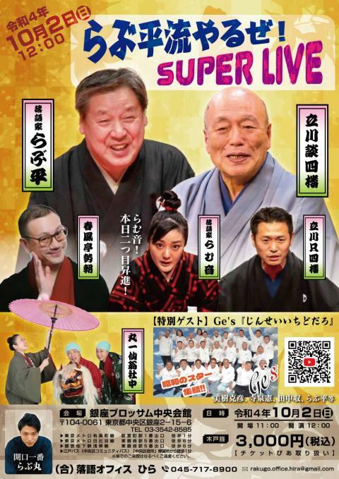 らぶ平流やるぜSUPERLIVE 22/10/2(日) 銀座ブロッサム(中央会館) シェア ツイート らぶ平流やるぜSUPERLIVE 開催情報 未就学児の入場不可 料金 全席自由-3,000円 表示できるチケット情報はありません詳しくはこちら キャスト&スタッフ 出演 らぶ平 らむ音 らぶ丸 立川談四楼 立川只四楼 丸一仙翁社中 美樹克彦 寺泉憲 春風亭勢朝 [出演]らぶ平 / らむ音 / らぶ丸 / 立川談四楼 / 立川只四楼 / 丸一仙翁社中 / 美樹克彦 / 寺泉憲 / 春風亭勢朝 お問い合わせ 主催 落語オフィス ひら シェア ツイート