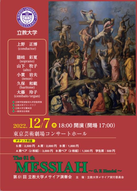 未就学児童は入場不可。ペアは2枚単位での販売。お車でのご来場はご遠慮ください。会場内ではマスク着用等、感染症対策にご協力をお願いいたします。一度お買い上げいただいたチケットは原則払い戻しいたしません。ご購入の際はhttps://rikkyouniv-messiah.jimdosite.com内の注意事項を一読下さい。チケットに関する問い合わせは61messhiah.uenotsuchi@gmail.comまでお願いします。お電話でのお問い合わせの場合お返事にお時間を頂戴いたします。ご了承ください。