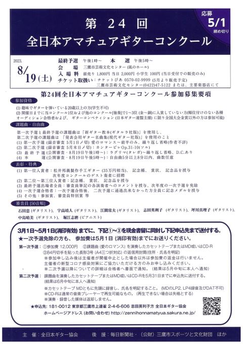 第24回 全日本アマチュアギターコンクール 23/8/19(土) 三鷹市芸術文化センター 風のホール(中ホール) シェア ツイート アマチュアギタリストのための、「ギターの甲子園」!! 開催情報 最終予選 午後1時~ / 本選 午後5時~ 料金 自由席-1,800円 表示できるチケット情報はありません詳しくはこちら お問い合わせ 全日本ギター協会 シェア ツイート