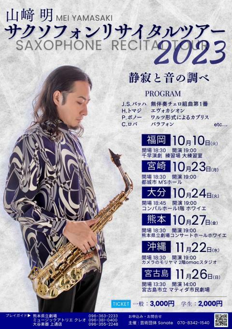 山崎明サクソフォンリサイタルツアー2023 23/10/10(火)~23/11/22(水) なみきスクエア干早演劇練習場大練習室、M'sホール、コンパルホール1階ホワイエ、熊本県立劇場 コンサートホール ホワイエ、カメラのモリヤマ2階omacスタジオ シェア ツイート 今年はたった1人でのコンサートツアーとなり、自分にとっても大きな挑戦となります!是非ご来場ください。 料金 全席自由 大学生以下-2,000円 全席自由 一般-3,000円 表示できるチケット情報はありません詳しくはこちら お問い合わせ 芸術団体 Sonate 事務局 シェア ツイート