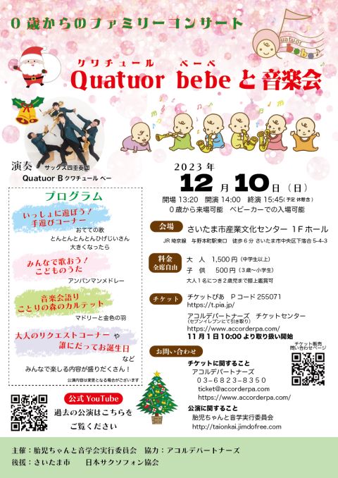 Quatuor bebeと音楽会 23/12/10(日) さいたま市産業文化センター シェア ツイート サックス四重奏団と医療者・保育士などがコラボレーションし、0歳から参加できる音楽会を開催しています 開催情報 出演者は都合により変更の可能性があります。入場年齢制限なし(0歳から入場可能)。大人:中学生以上、子供:3歳~小学生。大人1名につき2歳児まで膝上鑑賞可。 料金 全席自由 大人-1,500円 全席自由 子供-500円 表示できるチケット情報はありません詳しくはこちら キャスト&スタッフ 出演 Quatuor B 演奏 Quatuor B [出演]Quatuor B [演奏]Quatuor B お問い合わせ アコルデパートナーズ シェア ツイート