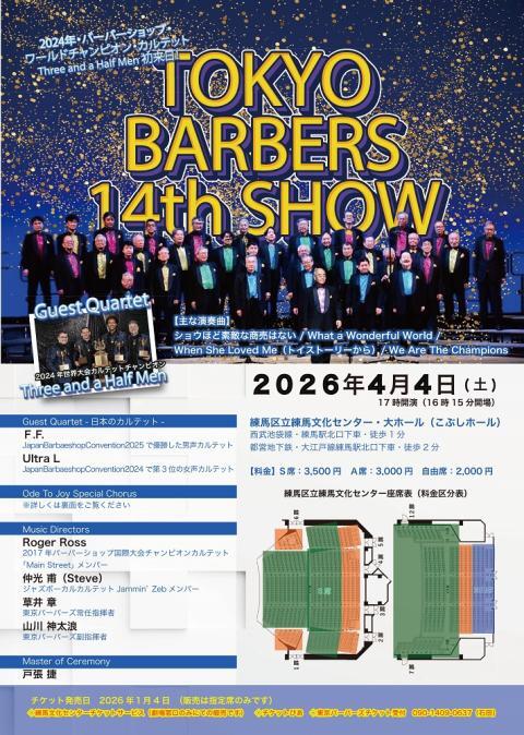 第14回東京バーバーズショウ 26/4/4(土) 練馬文化センター 大ホール(こぶしホール) シェア ツイート すべての写真(4)を見る 第14回目となる東京バーバーズ・ショウを開催します。 すべての写真(4)を見る 開催情報 ジャンル JAZZ/ワールドミュージック 料金 S席-3,500円 A席-3,000円 表示できるチケット情報はありません詳しくはこちら お問い合わせ 東京バーバーズ(石田) シェア ツイート
