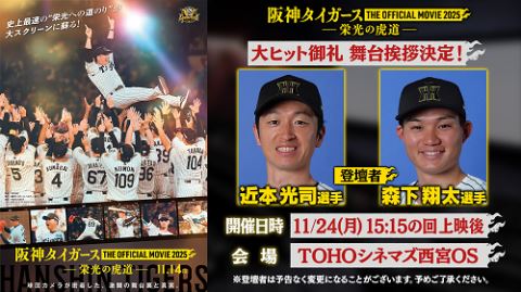 「阪神タイガース THE OFFICIAL MOVIE 2025-栄光の虎道-」公開記念舞台挨拶in西宮 25/11/24(月) TOHOシネマズ西宮OS シェア ツイート 開催情報 この上映会は発声や応援グッズ(楽器や旗、ジェット風船などはNG)の持ち込みがOKとなります。申込前に必ず注意事項をお読みください。 料金 一般-2,400円 高校生以下-1,400円 高校生以下-当日要学生証 表示できるチケット情報はありません詳しくはこちら キャスト&スタッフ メイン 阪神タイガース お問い合わせ TOHOシネマズ西宮OS シェア ツイート