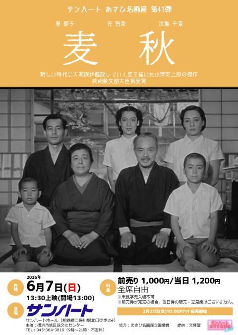 あさひ名画座第41弾「麦秋」 26/6/7(日) 横浜市旭区民文化センター(サンハート) ホール シェア ツイート 新しい時代に大家族が離散していく姿を描いた、小津安二郎の傑作を上映。 開催情報 未就学児入場不可。前売り券が完売の場合、当日券の販売・立見席はございません。 料金 全席自由-1,000円 表示できるチケット情報はありません詳しくはこちら お問い合わせ 横浜市旭区民文化センターサンハート シェア ツイート