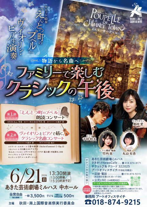 ファミリーで楽しむクラシックの午後 26/6/21(日) あきた芸術劇場ミルハス 中ホール シェア ツイート 絵本と音楽、そして名曲の数々。この午後で、音楽の楽しさと奥深さに出会います。 開催情報 子どもは4歳以上~中学生未満。 料金 全席自由 一般-3,500円 全席自由 子ども-500円 表示できるチケット情報はありません詳しくはこちら キャスト&スタッフ 出演 千田桂大 奥村愛 竹内恵 丸山有香 [出演]千田桂大(ピアノ) / 奥村愛(ヴァイオリン) / 竹内恵(ピアノ・構成・編曲) / 丸山有香(朗読) お問い合わせ 秋田・潟上国際音楽祭実行委員会事務局 シェア ツイート
