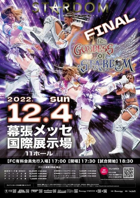 第12回 ゴッデス・オブ・スターダム ~タッグリーグ優勝決定戦~ 22/12/4(日)~22/12/7(水) PIA LIVE STREAM シェア ツイート 開催情報 ジャンル プロレス この大会はオンライン動画配信でご覧いただけます。配信時間・出場者は予定のため変更の可能性あり。【公演に関する問合せ】info-stardom@bushiroad.com【PIA LIVE STREAM視聴についての問合せ】電話:017-718-3572/メール:event@linkst.jp(平日10:00~18:00)※問合せ対応は該当公演(土日祝含む)の終演後1時間程度で終了とさせていただきます。 料金 オンラインライブ視聴券-4,400円 表示できるチケット情報はありません詳しくはこちら キャスト&スタッフ メイン スターダム シェア ツイート