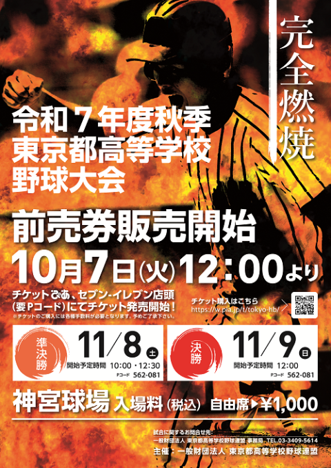 令和7(2025)年度 秋季東京都高等学校野球大会 25/11/8(土)~25/11/9(日) 神宮球場 シェア ツイート 開催情報 ジャンル 野球 中学生以下無料。但し入場時、中学生は必ず生徒手帳をご提示ください。高校生以上の学生は、学生証を提示の上、学生券(500円)を当日窓口でのみ販売。雨天その他で試合中止となった場合、チケットは予定された開催日ではなく「令和7年度秋季東京都高等学校野球大会」各順延日にのみ有効。日程変更による払戻しなし。準決勝は2試合観戦可(1試合でも試合成立の場合チケットの払戻し不可)。 料金 自由席 一般券-1,000円 表示できるチケット情報はありません詳しくはこちら お問い合わせ 東京都高等学校野球連盟 シェア ツイート
