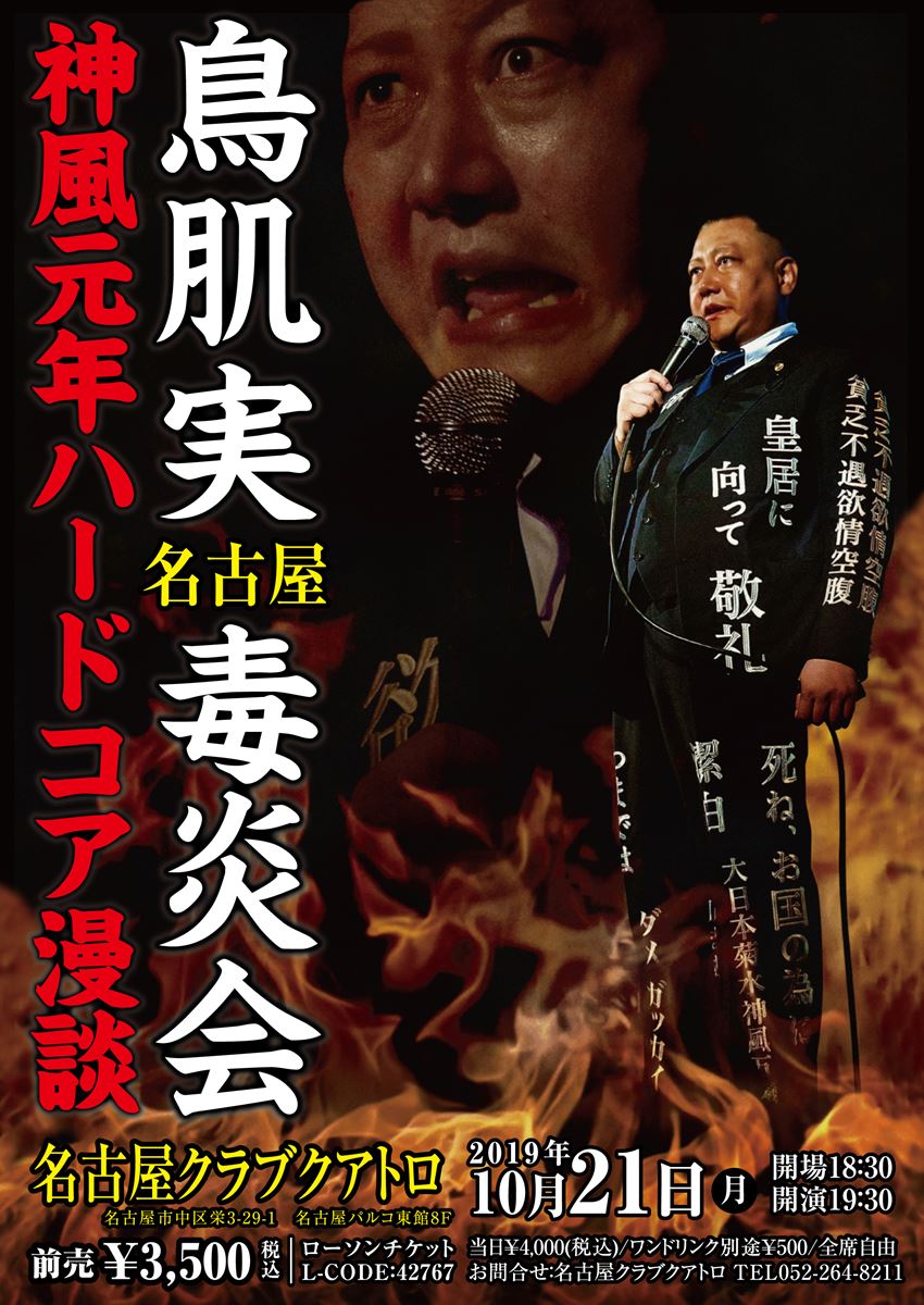 鳥肌実 名古屋毒炎会『神風元年ハードコア漫談』 19/10/21(月) 名古屋クラブクアトロ シェア ツイート 上演情報 ジャンル お笑い 料金 前売-3,500円当日-4,000円 全席自由・整理番号なしドリンク代別途600円 表示できるチケット情報はありません詳しくはこちら キャスト&スタッフ 出演 鳥肌実 [出演]鳥肌実 お問い合わせ 名古屋クラブクアトロ 公式サイト シェア ツイート