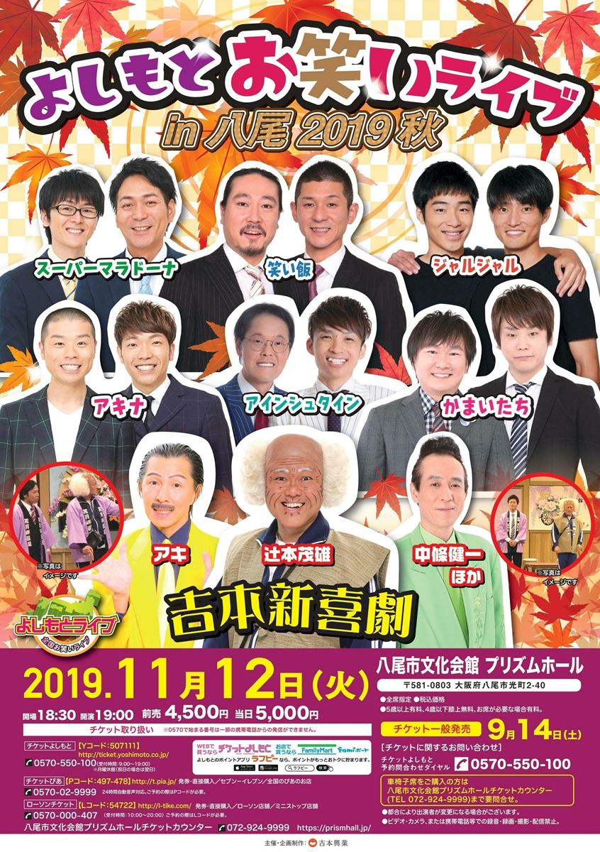 よしもとお笑いライブin八尾 2019秋 19/11/12(火) 八尾市文化会館(プリズムホール) 大ホール シェア ツイート 上演情報 ジャンル お笑い 料金 前売-4,500円当日-5,000円 全席指定5歳以上は有料、4歳以下は膝上のみ無料車いすの方はチケット購入前に会場八尾市文化会館プリズムホールチケットカウンターまで要問合せ 表示できるチケット情報はありません詳しくはこちら キャスト&スタッフ 出演 笑い飯 スーパーマラドーナ ジャルジャル かまいたち アキナ アインシュタイン 辻本茂雄 水玉れっぷう隊・アキ 中條健一 [出演]笑い飯 / スーパーマラドーナ / ジャルジャル / かまいたち / アキナ / アインシュタイン / 辻本茂雄 / 水玉れっぷう隊・アキ / 中條健一 お問い合わせ 八尾市文化会館プリズムホールチケットカウンター チケットよしもと予約問合せダイヤル 10:00~19:00 公式サイト シェア ツイート
