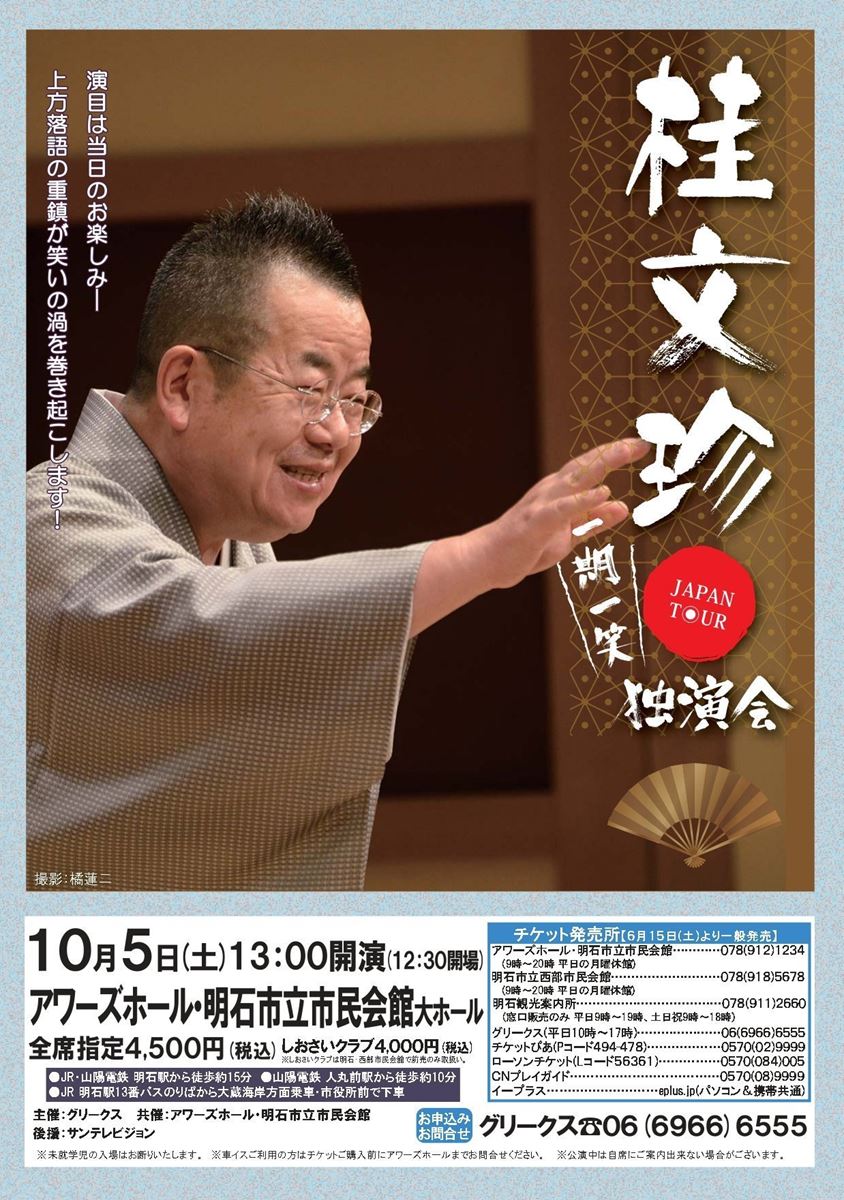 桂文珍 独演会 19/10/5(土) 明石市立市民会館 大ホール シェア ツイート 上演情報 ジャンル 落語/演芸 料金 【全席指定】4,500円 ※未就学児童は入場不可。 表示できるチケット情報はありません詳しくはこちら キャスト&スタッフ 出演 桂文珍 お問い合わせ グリークス シェア ツイート