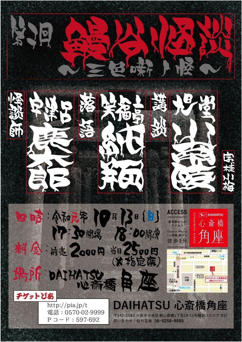純瓶・小南陵・鹿太郎 第二回鰻谷怪談 ~三色噺ノ怪~ 19/10/13(日) DAIHATSU 心斎橋角座 シェア ツイート 上演情報 ジャンル 落語/演芸 料金 【全席指定】2,000円 ※未就学児童は入場不可。出演者は変更になる場合があります。 表示できるチケット情報はありません詳しくはこちら キャスト&スタッフ 出演 笑福亭純瓶 旭堂小南陵(5代目) 宇津呂鹿太郎 お問い合わせ 松竹芸能 シェア ツイート