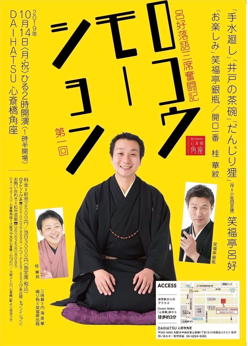 呂好・銀瓶・華紋 第一回ロコウモーション ~呂好落語三席奮闘記~ 19/10/14(月) DAIHATSU 心斎橋角座 シェア ツイート 上演情報 ジャンル 落語/演芸 【演目】 笑福亭呂好 「手水廻し」「井戸の茶碗」「だんじり狸」 料金 【全席指定】2,500円 ※未就学児童は入場不可。出演者は変更になる場合があります。 表示できるチケット情報はありません詳しくはこちら キャスト&スタッフ 出演 笑福亭呂好 笑福亭銀瓶 桂華紋 [出演]笑福亭 お問い合わせ 松竹芸能 シェア ツイート