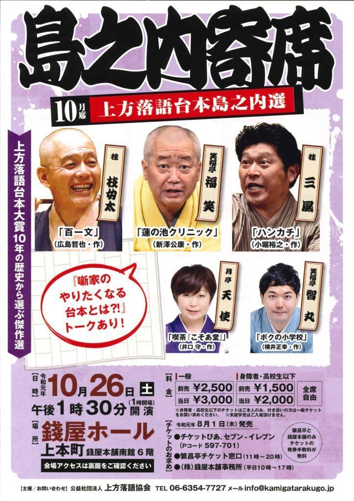 福笑・枝女太・三風 島之内寄席 10月 19/10/26(土) 錢屋ホール シェア ツイート 上演情報 ジャンル 落語/演芸 【演目】 笑福亭智丸 「ボクの小学校」 月亭天使 「喫茶『こそあ堂』」 桂枝女太 「百一文」 ~仲入~ 桂三風 「ハンカチ」 笑福亭福笑 「蓮の池クリニック」 料金 【全席自由】 一般-2,500円 身障者・高校生以下-1,500円 ※未就学児童は入場不可。 表示できるチケット情報はありません詳しくはこちら キャスト&スタッフ 出演 笑福亭福笑 桂枝女太 桂慶枝 月亭天使 笑福亭智丸 お問い合わせ 上方落語協会 シェア ツイート