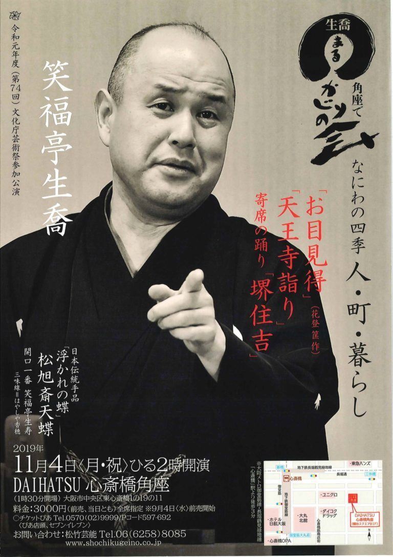 生喬・生寿・天蝶 生喬まるかじりの会 なにわの四季 人・町・暮らし 19/11/4(月) DAIHATSU 心斎橋角座 シェア ツイート 上演情報 ジャンル 落語/演芸 【演目】 笑福亭生喬 「お目見得」(作:花登筺) 「天王寺詣り」 寄席の踊り「堺住吉」 松旭斎天蝶 「浮かれの蝶」 笑福亭生寿 「開口一番」 三味線:はやしや香穂 料金 【全席指定】3,000円 ※未就学児童は入場不可。※出演者は変更になる場合があります。 表示できるチケット情報はありません詳しくはこちら キャスト&スタッフ 出演 笑福亭生喬 笑福亭生寿 ゲスト 松旭斎天蝶 お問い合わせ 松竹芸能 シェア ツイート