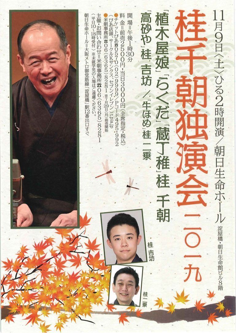 桂千朝独演会 19/11/9(土) 朝日生命ホール シェア ツイート 上演情報 ジャンル 落語/演芸 【演目】 桂千朝 「植木屋娘」 「らくだ」 「蔵丁稚」 桂吉坊 「高砂屋」 桂二乗 「牛ほめ」 料金 【全席指定】 前売-2,500円 当日-3,000円 ※未就学児童は入場不可。 表示できるチケット情報はありません詳しくはこちら キャスト&スタッフ 出演 桂千朝 桂吉坊 桂二乗 お問い合わせ 米朝事務所 シェア ツイート
