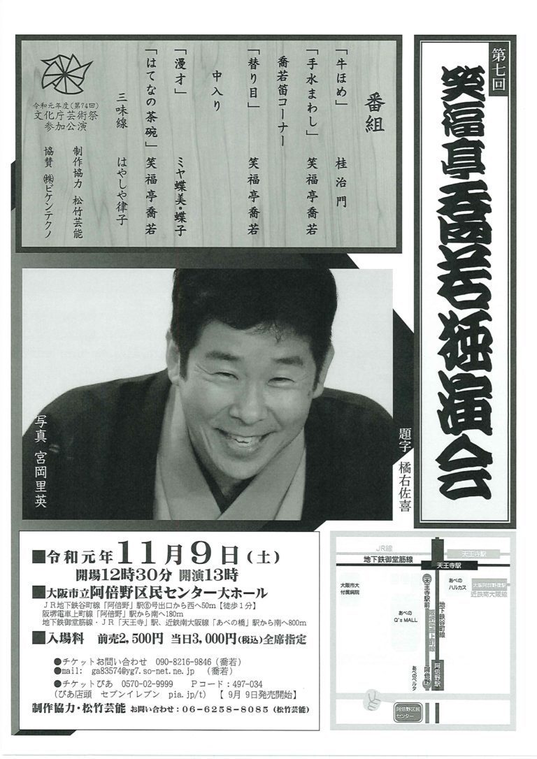 喬若・治門 第七回 笑福亭喬若独演会 19/11/9(土) 阿倍野区民センター 大ホール シェア ツイート 上演情報 ジャンル 落語/演芸 【演目】 桂治門 「牛ほめ」 笑福亭喬若 「手水廻し」 喬若笛コーナー 笑福亭喬若 「替り目」 ー中入ー ミヤ蝶美・蝶子 「漫才」 笑福亭喬若 「はてなの茶碗」 ※三味線:はやしや律子 料金 【全席指定】 前売-2,500円 当日-3,000円 ※未就学児童は入場不可。※出演者は変更になることがあります。 表示できるチケット情報はありません詳しくはこちら キャスト&スタッフ 出演 笑福亭喬若 桂治門 ゲスト パピヨンズ お問い合わせ 松竹芸能 シェア ツイート