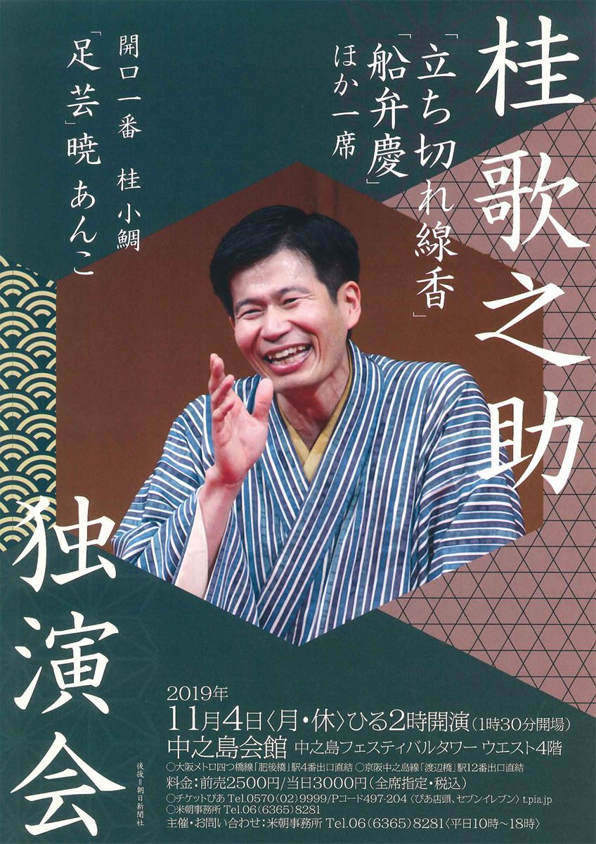 桂歌之助独演会 19/11/4(月) 中之島会館 シェア ツイート 上演情報 ジャンル 落語/演芸 【演目】 桂歌之助 「船弁慶」「立ち切れ線香」ほか一席 桂小鯛 「開口一番」 暁あんこ 「足芸」 料金 【全席指定】 前売-2,500円 当日-3,000円 ※未就学児童は入場不可。 表示できるチケット情報はありません詳しくはこちら キャスト&スタッフ 出演 桂歌之助 桂小鯛 暁あんこ お問い合わせ 米朝事務所 シェア ツイート
