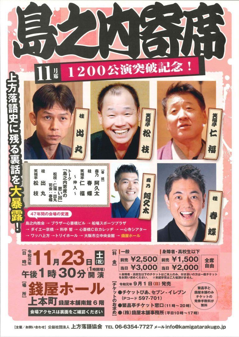 松枝・仁福・出丸 島之内寄席 11月 19/11/23(土) 錢屋ホール シェア ツイート 上演情報 ジャンル 落語/演芸 【演目】『1200公演突破記念』 森乃阿久太 桂春蝶 笑福亭仁福 ~仲入~ トーク「島之内の思い出」松枝・仁福・出丸 司会:春蝶 桂出丸 笑福亭松枝 料金 【全席自由】 一般-2,500円 身障者・高校生以下-1,500円 ※未就学児童は入場不可。 表示できるチケット情報はありません詳しくはこちら キャスト&スタッフ 出演 笑福亭松枝 笑福亭仁福 桂出丸 桂春蝶 森乃阿久太 お問い合わせ 上方落語協会 シェア ツイート