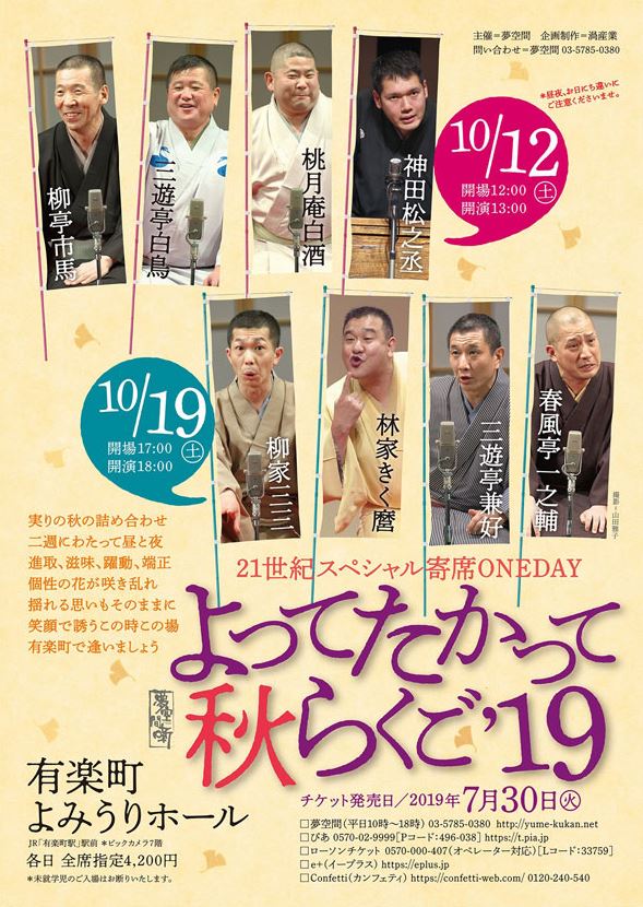 よってたかって秋らくご 19/10/12(土)~19/10/19(土) 有楽町よみうりホール シェア ツイート 上演情報 ジャンル 落語/演芸 ※10/12(日)公演は台風のため開催中止 【出演】〈10/12日〉 柳亭市馬/三遊亭白鳥/桃月庵白酒/神田松之丞 ※開催中止〈10/19日〉 柳家三三/林家きく麿/三遊亭兼好/春風亭一之輔 料金 【全席指定】4,200円 ※未就学児童は入場不可。 表示できるチケット情報はありません詳しくはこちら キャスト&スタッフ 出演 柳亭市馬 柳家三三 三遊亭白鳥 林家きく麿 桃月庵白酒 三遊亭兼好 神田松之丞 春風亭一之輔 お問い合わせ 夢空間 シェア ツイート