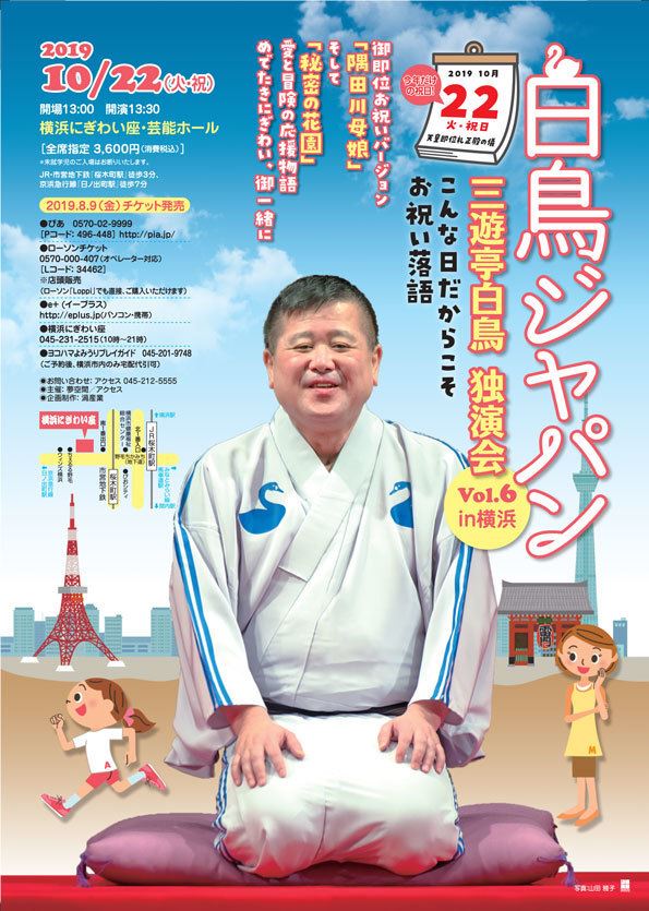 三遊亭白鳥独演会 白鳥ジャパン VOL.6 in 横浜 19/10/22(火) 横浜にぎわい座 芸能ホール シェア ツイート 上演情報 ジャンル 落語/演芸 【演目】 「隅田川母娘」「秘密の花園」 料金 【全席指定】3,600円 ※未就学児童は入場不可。 表示できるチケット情報はありません詳しくはこちら キャスト&スタッフ 出演 三遊亭白鳥 お問い合わせ アクセス シェア ツイート