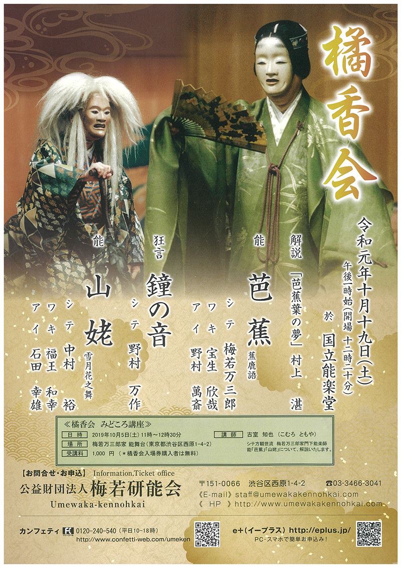 橘香会 19/10/19(土) 国立能楽堂 シェア ツイート 演目能『芭 蕉』蕉鹿語 梅若万三郎狂言『鐘の音』野村万作仕舞『杜 若』キリ 梅若万佐晴 『実 盛』キリ 浅井文義 『井 筒』野村四郎能『山 姥』雪月花之舞 中村裕 上演情報 ジャンル 能/狂言 料金 S席-12,000円A席-10,000円B席-8,000円GB席-6,000円 学生割あり:各席3,000円引 キャスト&スタッフ 出演 梅若万三郎 野村万作 [出演]村上湛 / 梅若万三郎 / 野村万作 / 他 お問い合わせ 梅若研能会 梅若研能会 公式サイト シェア ツイート