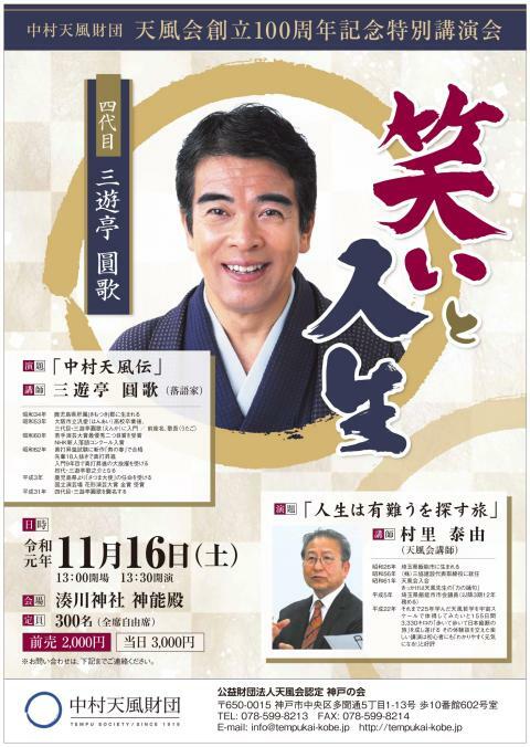 三遊亭圓歌独演会「笑いと人生」 中村天風財団創立100周年記念 19/11/16(土) 湊川神社 神能殿 シェア ツイート 中村天風財団創立100周年記念特別講演会で、三遊亭圓歌師匠による新作落語が本邦初公開! 上演情報 ジャンル 落語/演芸 【演目】 三遊亭圓歌 「中村天風伝」 村里泰由 「人生は有難うを探す旅」 料金 【全席自由】 前売-2,000円 当日-3,000円 ※定員300名※前売完売の場合、当日券なし。 表示できるチケット情報はありません詳しくはこちら キャスト&スタッフ 出演 三遊亭歌之介 村里泰由 お問い合わせ 公益財団法人天風会認定 神戸の会 シェア ツイート