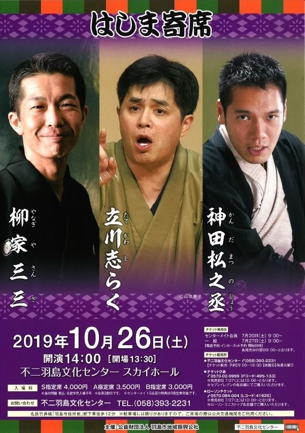 志らく・三三・松之丞 はしま寄席 19/10/26(土) 不二羽島文化センター スカイホール シェア ツイート 上演情報 ジャンル 落語/演芸 料金 【全席指定】 S席-4,000円 A席-3,500円 B席-3,000円 ※未就学児童は入場不可。 表示できるチケット情報はありません詳しくはこちら キャスト&スタッフ 出演 立川志らく 柳家三三 神田松之丞 お問い合わせ 不二羽島文化センター シェア ツイート