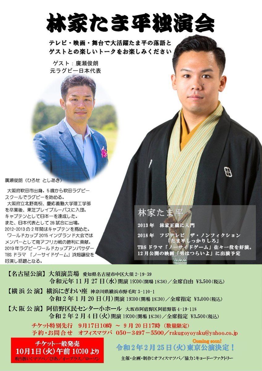 林家たま平独演会 19/11/27(水) 大須演芸場 シェア ツイート 上演情報 ジャンル 落語/演芸 料金 【全席自由】 一般-3,500円 小学生以下-2,000円 ※未就学児童は入場不可。 表示できるチケット情報はありません詳しくはこちら キャスト&スタッフ 出演 林家たま平 廣瀬俊朗 お問い合わせ オフィス マツバ シェア ツイート