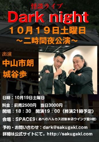 怪談ライブ Dark night vol.33 ~夜公演~ 19/10/19(土) SPACE9 (あべのハルカス近鉄本店ウイング館 9F) シェア ツイート 上演情報 ジャンル 落語/演芸 料金 前売-2,500円当日-3,000円 キャスト&スタッフ 出演 中山市朗 城谷歩 お問い合わせ 中村壮快 公式サイト シェア ツイート