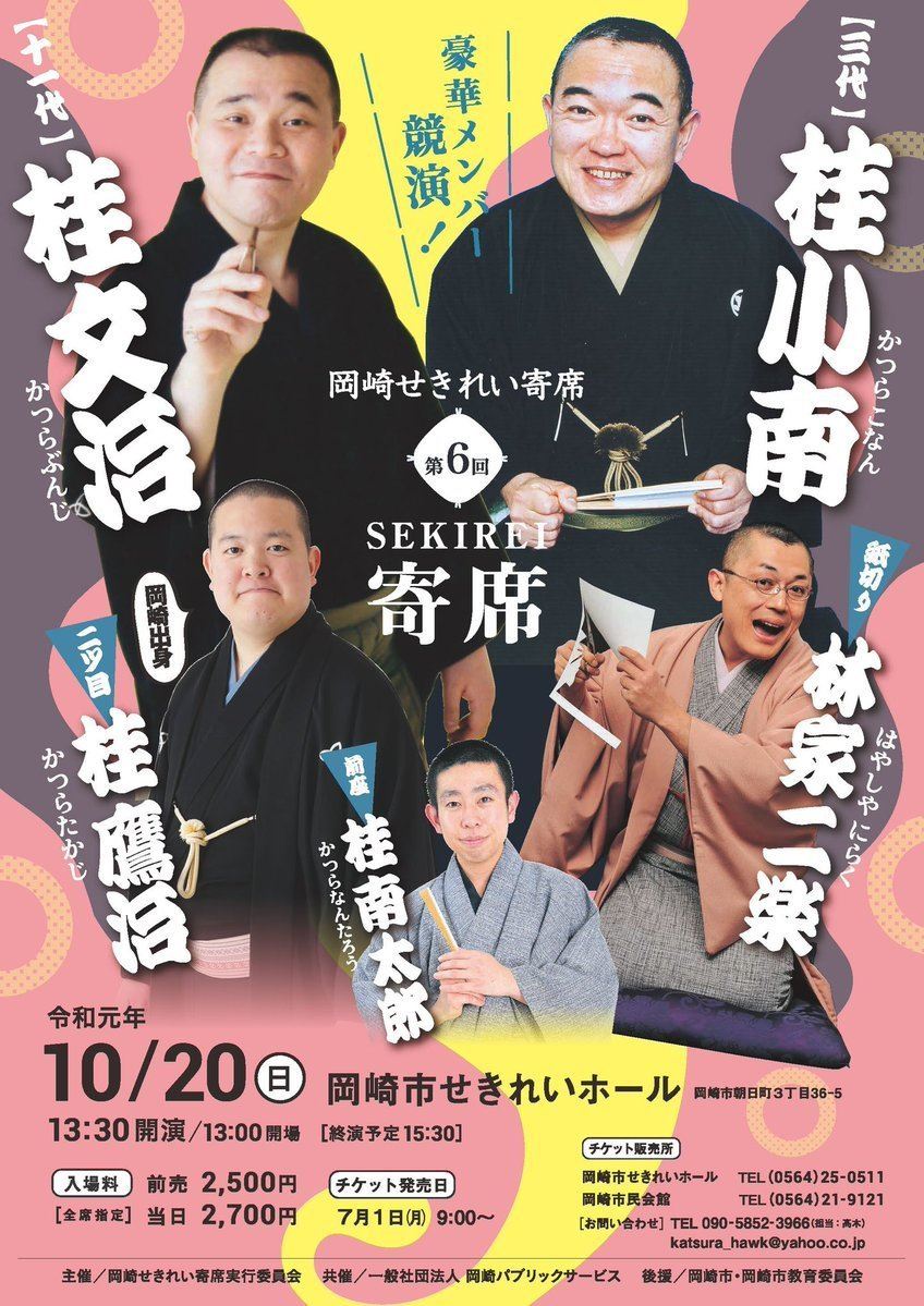 小南・文治・二楽 第6回 岡崎せきれい寄席 19/10/20(日) 岡崎市せきれいホール シェア ツイート 上演情報 ジャンル 落語/演芸 料金 【全席指定】 前売-2,500円 当日-2,700円 キャスト&スタッフ 出演 桂小南 桂文治 林家二楽 桂鷹治 桂南楽 お問い合わせ 岡崎市せきれいホール シェア ツイート