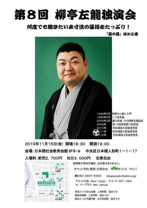 第8回 柳亭左龍独演会 19/11/15(金) 日本橋社会教育会館 シェア ツイート 何度でも聴きたい本寸法の落語をたっぷり!「茶の湯」ほか2席 上演情報 ジャンル 落語/演芸 料金 【全席自由】 前売-2,700円 当日-3,000円 表示できるチケット情報はありません詳しくはこちら キャスト&スタッフ 出演 柳亭左龍 お問い合わせ オフィスマツバ シェア ツイート