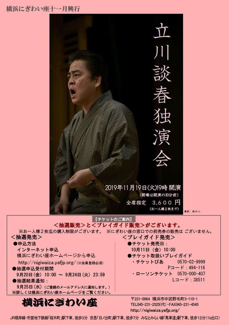 立川談春独演会 19/11/19(火) 横浜にぎわい座 芸能ホール シェア ツイート 上演情報 ジャンル 落語/演芸 料金 【全席指定】3,600円 表示できるチケット情報はありません詳しくはこちら キャスト&スタッフ 出演 立川談春 お問い合わせ 横浜にぎわい座 シェア ツイート