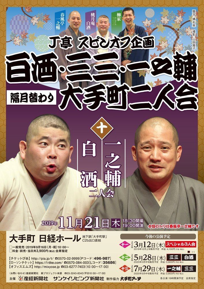 白酒・一之輔 第10回 J亭スピンオフ企画 隔月替わり大手町二人会 19/11/21(木) 日経ホール シェア ツイート 上演情報 ジャンル 落語/演芸 料金 【全席指定】3,900円 ※未就学児童は入場不可。 表示できるチケット情報はありません詳しくはこちら キャスト&スタッフ 出演 春風亭一之輔 桃月庵白酒 お問い合わせ 産経新聞社 新プロジェクト本部 シェア ツイート
