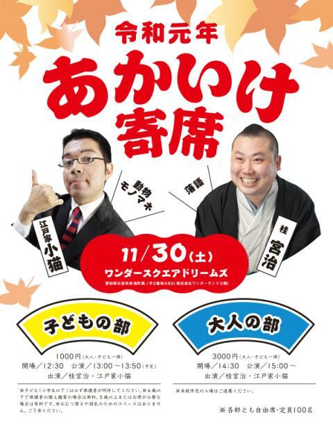 あかいけ寄席 桂宮治・江戸家小猫 子どもの部 19/11/30(土) ワンダースクエアドリームズ シェア ツイート 注目度No.1落語家、桂宮治と抱腹絶倒動物モノマネの江戸家小猫がやってくる! 上演情報 ジャンル 落語/演芸 ●小学生以下のお子さまは必ず保護者同伴でお申し込みください。●おむつ替えや授乳のためのスペースはありません。ご了承ください。●駐車場はありませんので公共交通機関が近隣のコインパーキングをご利用ください。●4歳以下で保護者の膝上鑑賞の場合は無料。 料金 全席自由-1,000円 表示できるチケット情報はありません詳しくはこちら キャスト&スタッフ 出演 桂宮治 江戸家小猫 [出演]桂宮治 / 江戸家小猫 お問い合わせ 子どもと落語実行委員会 シェア ツイート