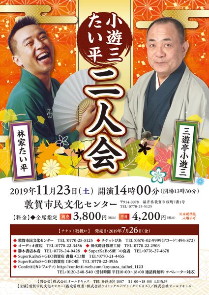 三遊亭小遊三・林家たい平 二人会 19/11/23(土) 敦賀市民文化センター 大ホール シェア ツイート すべての写真(3)を見る すべての写真(3)を見る 上演情報 ジャンル 落語/演芸 未就学児童は入場不可。 料金 全席指定-3,800円 表示できるチケット情報はありません詳しくはこちら キャスト&スタッフ メイン 三遊亭小遊三 林家たい平 お問い合わせ オールドキッズ シェア ツイート