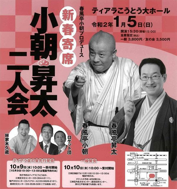春風亭小朝プロデュース 新春寄席 小朝・昇太二人会 20/1/5(日) ティアラこうとう 大ホール シェア ツイート 上演情報 ジャンル 落語/演芸 料金 【全席指定】3,800円 ※未就学児童は入場不可。 表示できるチケット情報はありません詳しくはこちら キャスト&スタッフ 出演 春風亭小朝 春風亭昇太 ロケット団 林家木久蔵 お問い合わせ ティアラこうとうチケットサービス シェア ツイート