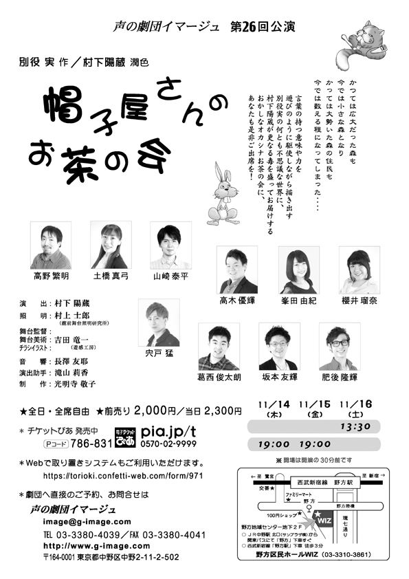 声の劇団イマージュ『帽子屋さんのお茶会』 19/11/14(木)~19/11/16(土) 野方区民ホール シェア ツイート 上演情報 ジャンル 小劇場 料金 前売-2,000円当日-2,300円 全席自由 表示できるチケット情報はありません詳しくはこちら キャスト&スタッフ 作 別役実 メイン 声の劇団イマージュ [作]別役実 お問い合わせ 声の劇団イマージュ 公式サイト シェア ツイート