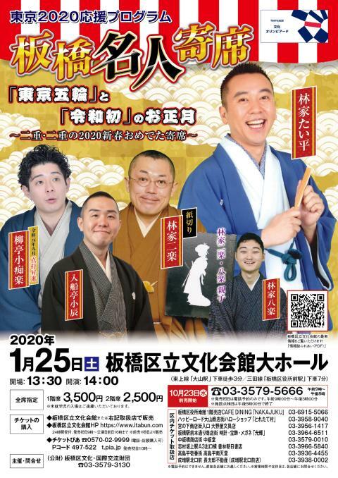 板橋名人寄席 20/1/25(土) 板橋区立文化会館 大ホール シェア ツイート 「東京五輪」と「令和初」のお正月~二重・二重の2020新春おめでた寄席~ 上演情報 ジャンル 落語/演芸 未就学児は入場不可。車椅子席は板橋区立文化会館チケットセンター(03-3579-5666)からご購入ください。お車でのご来場はご遠慮ください。 料金 1階席-3,500円 2階席-2,500円 表示できるチケット情報はありません詳しくはこちら キャスト&スタッフ 出演 入船亭小辰 林家たい平 林家二楽 林家八楽 柳亭小痴楽 [出演]林家たい平 / 柳亭小痴楽 / 入船亭小辰 / 林家二楽 / 林家八楽 お問い合わせ 公益財団法人 板橋区文化・国際交流財団 シェア ツイート