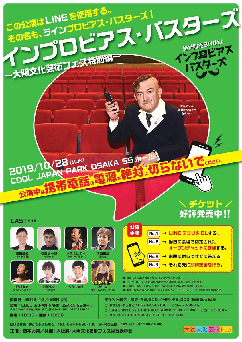 インプロビアス・バスターズ~大阪文化芸術フェス特別編~ 19/10/28(月) COOL JAPAN PARK OSAKA SSホール シェア ツイート 上演情報 ジャンル 小劇場 お笑い 料金 前売-2,500円当日-3,000円 全席自由・整理番号付5歳以上は有料4歳以下は膝上のみ無料、席が必要な場合は有料車いすの方は、チケット購入前に問合せ先まで要連絡 表示できるチケット情報はありません詳しくはこちら キャスト&スタッフ 出演 後藤ひろひと のぶよし クスミヒデオ 橋田雄一郎 久保田浩 野村有志 もう中学生 石塚朱莉 [出演]後藤ひろひと / 森田展義 / クスミヒデオ / 橋田雄一郎 / 久保田浩 / 野村有志 / もう中学生 / 石塚朱莉 お問い合わせ チケットよしもと予約問合せダイヤル 10:00~19:00 公式サイト シェア ツイート
